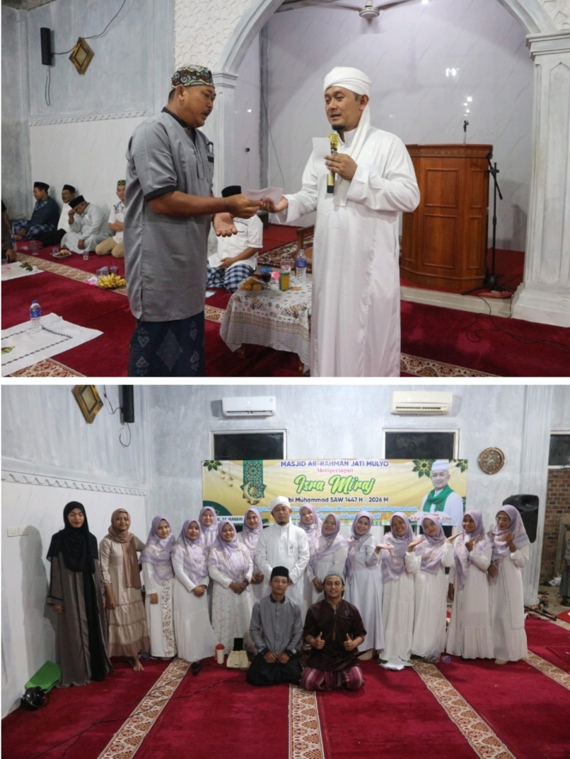 Lampung Selatan — Anggota DPRD Provinsi Lampung Komisi V, Puji Sartono, S.H., S.Kep, menghadiri sekaligus menjadi penceramah dalam acara Peringatan Isra Mi’raj Nabi Muhammad SAW 1447 Hijriah yang digelar di Masjid Ar-Rahman, Desa Jatimulyo, Kecamatan Jatiagung, Kabupaten Lampung Selatan, (Sabt 24 Januari 2026)