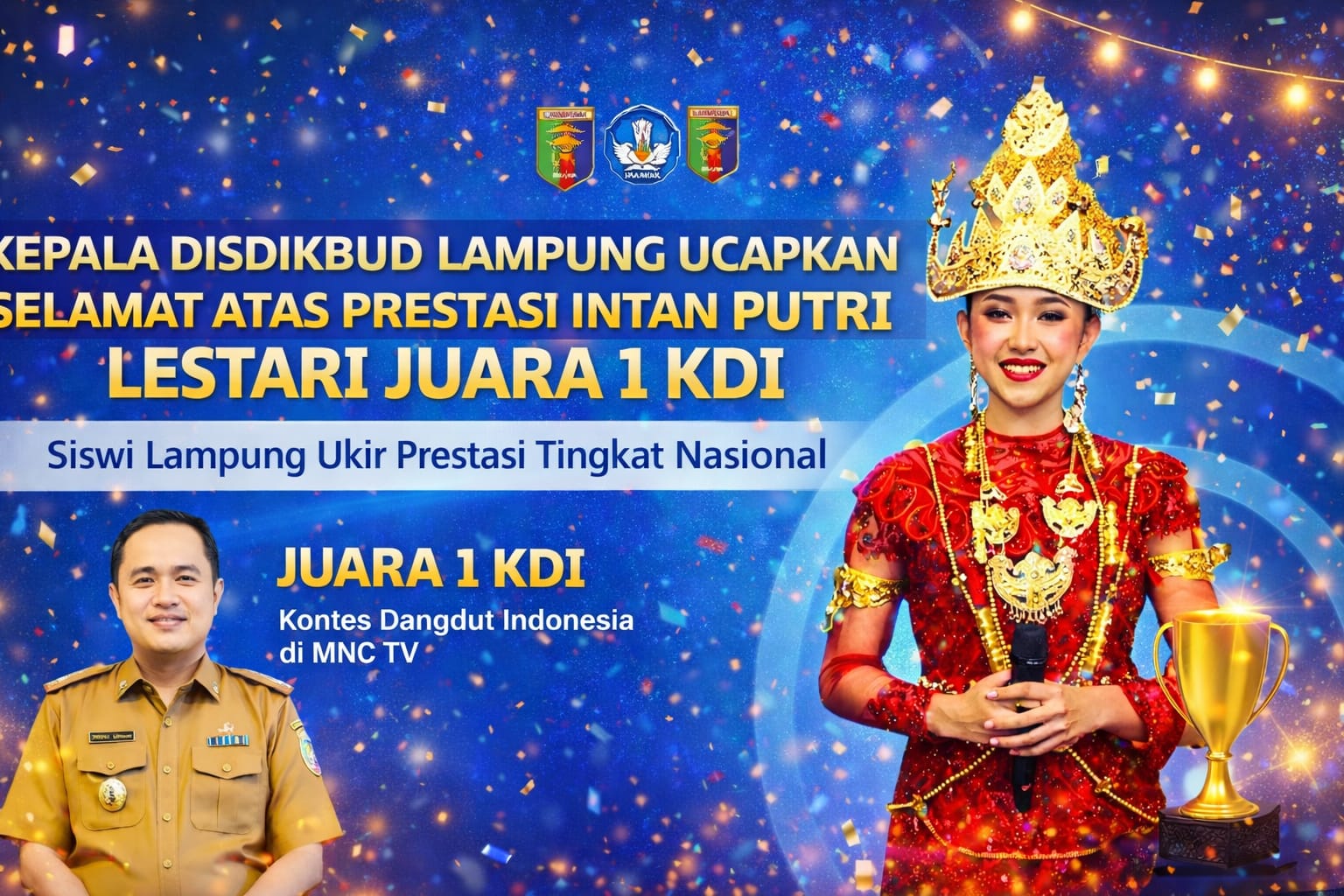 Bandar Lampung, Cakrawala Post – Kepala Dinas Pendidikan dan Kebudayaan Provinsi Lampung, Thomas Amirico, menyampaikan ucapan selamat dan apresiasi kepada Intan Putri Lestari, siswi SMA Negeri 1 Sekampung, yang berhasil meraih Juara 1 dalam ajang Kontes Dangdut Indonesia yang disiarkan oleh MNCTV.